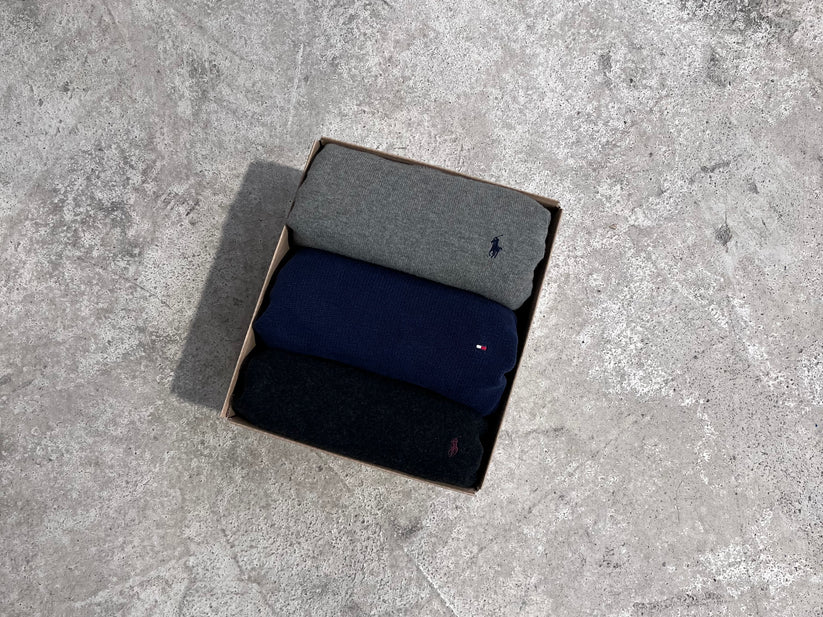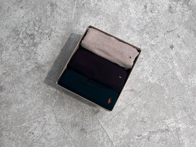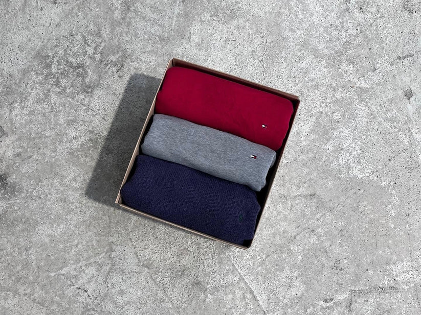 A selection of Ralph Lauren & Tommy Hilfiger sweaters. The sweaters can be both simple or 1/4 sweaters. They may be unicolor or striped. This bundle comes in different colors, styles and sizes.